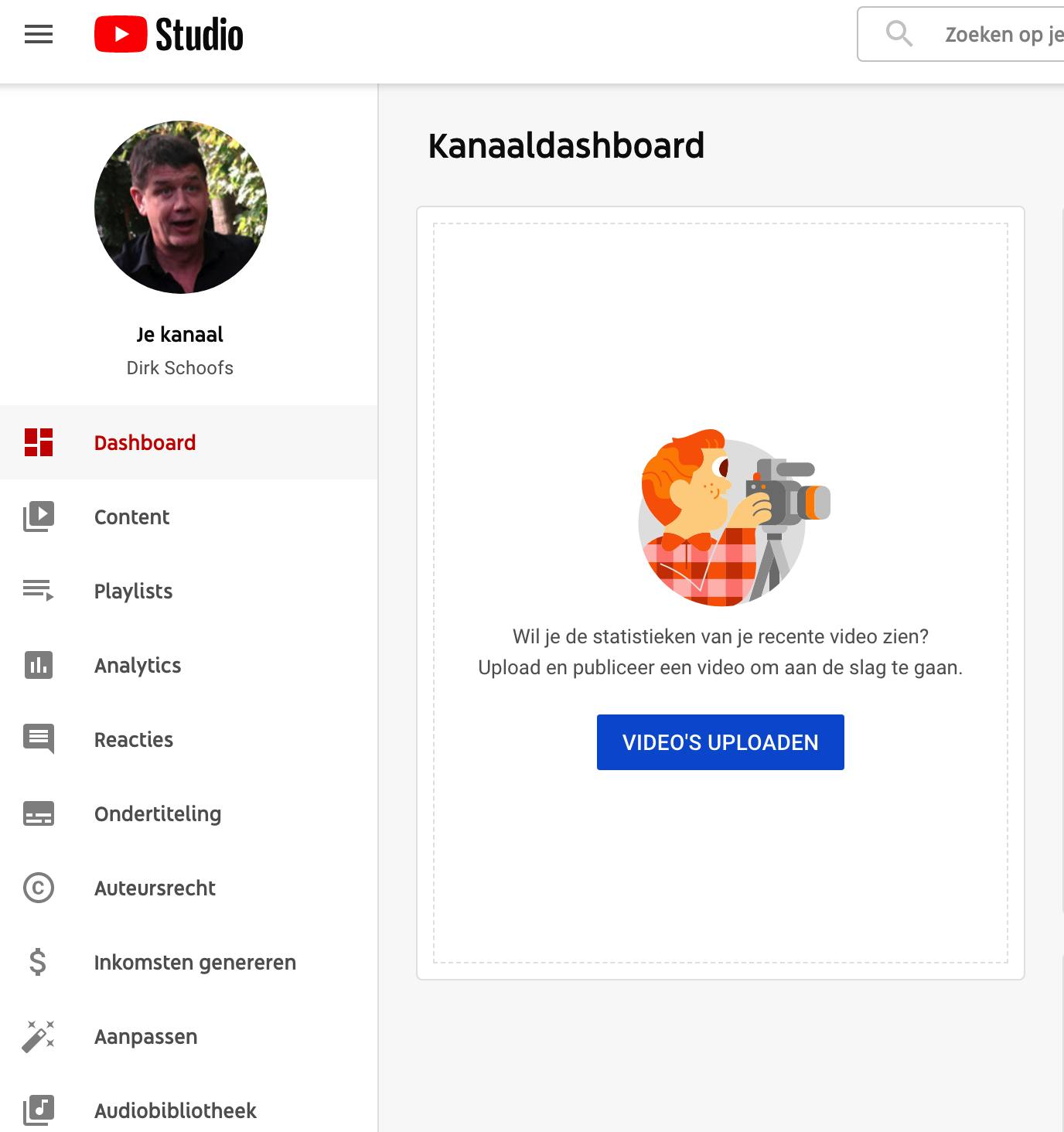 Nadat je het juiste kanaal hebt geselecteerd, ga je nogmaals naar je profielafbeelding en daar open je YouTube Studio. Deze online app heeft verschillende functies die verstopt zitten in de balk aan de linkerkant. Standaard kom je in het Dashboard en daar klik je op het pictogram van het toverstafje: Aanpassen.