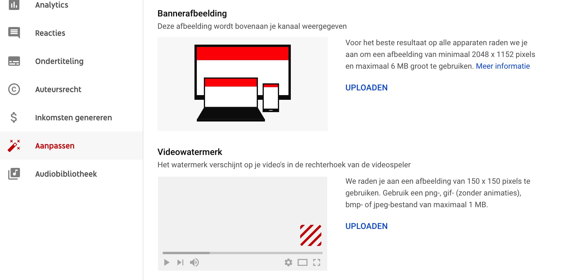 YouTube specifieert de eigenschappen van zo’n watermerk. Het gaat om een afbeelding van 150 × 150 pixels. Dat is klein, maar het logo mag uiteraard de videobeleving niet verstoren. Bovendien moet het een png-, jpg-, bmp- of gif-bestand zijn. Gif-animaties werken niet en het bestand mag maximum 1 MB groot zijn.