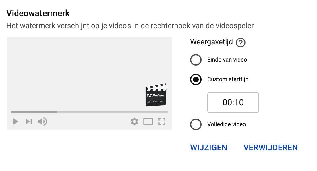 Het watermerk verschijnt in de rechterbenedenhoek bij alle video’s van dit kanaal. En in het volgende venster kun je aangeven wanneer het tevoorschijn komt. Er zijn drie opties: Einde van video, Custom starttijd, Volledige Video.