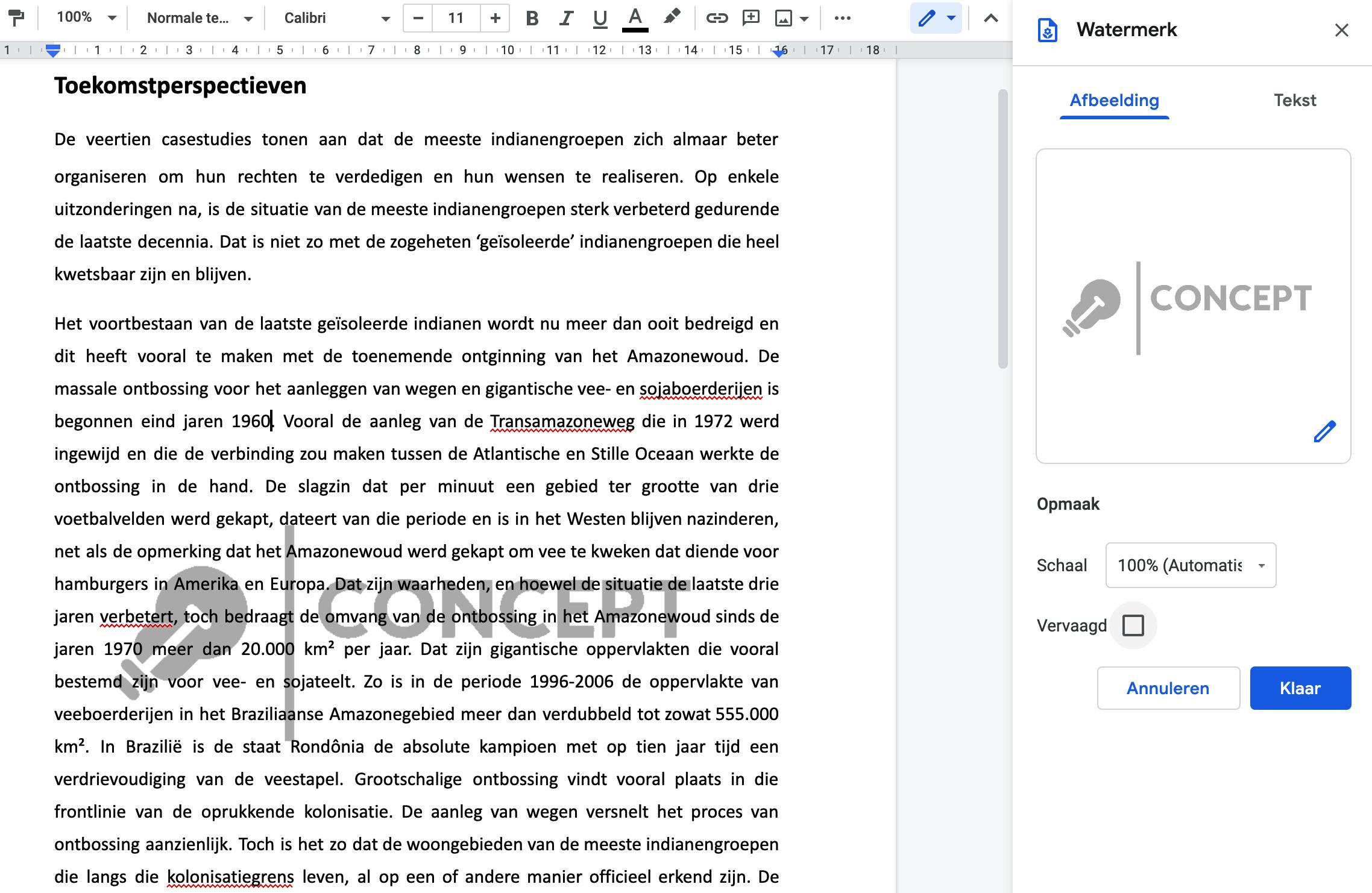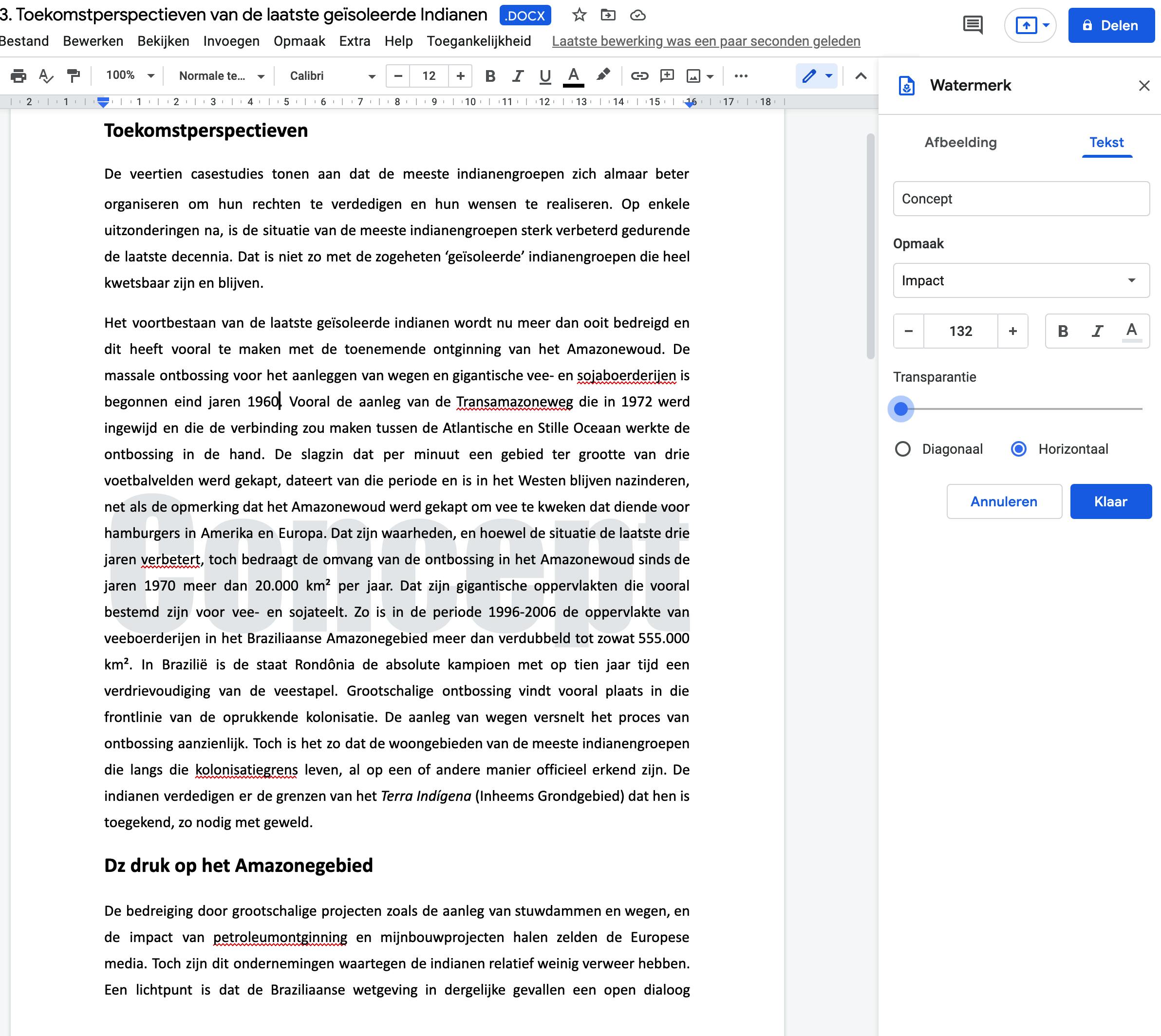 Dit watermerk zal op iedere pagina van het document verschijnen, dus niet alleen op het eerste blad. Je kunt het watermerk zowel Horizontaal als Diagonaal plaatsen. Als je de regelaar Transparantie op nul zet, komt de tekst van het watermerk altijd in zachtgrijs onder de inhoud. Hoe meer je de transparantie verhoogt, hoe minder zichtbaar het watermerk wordt.