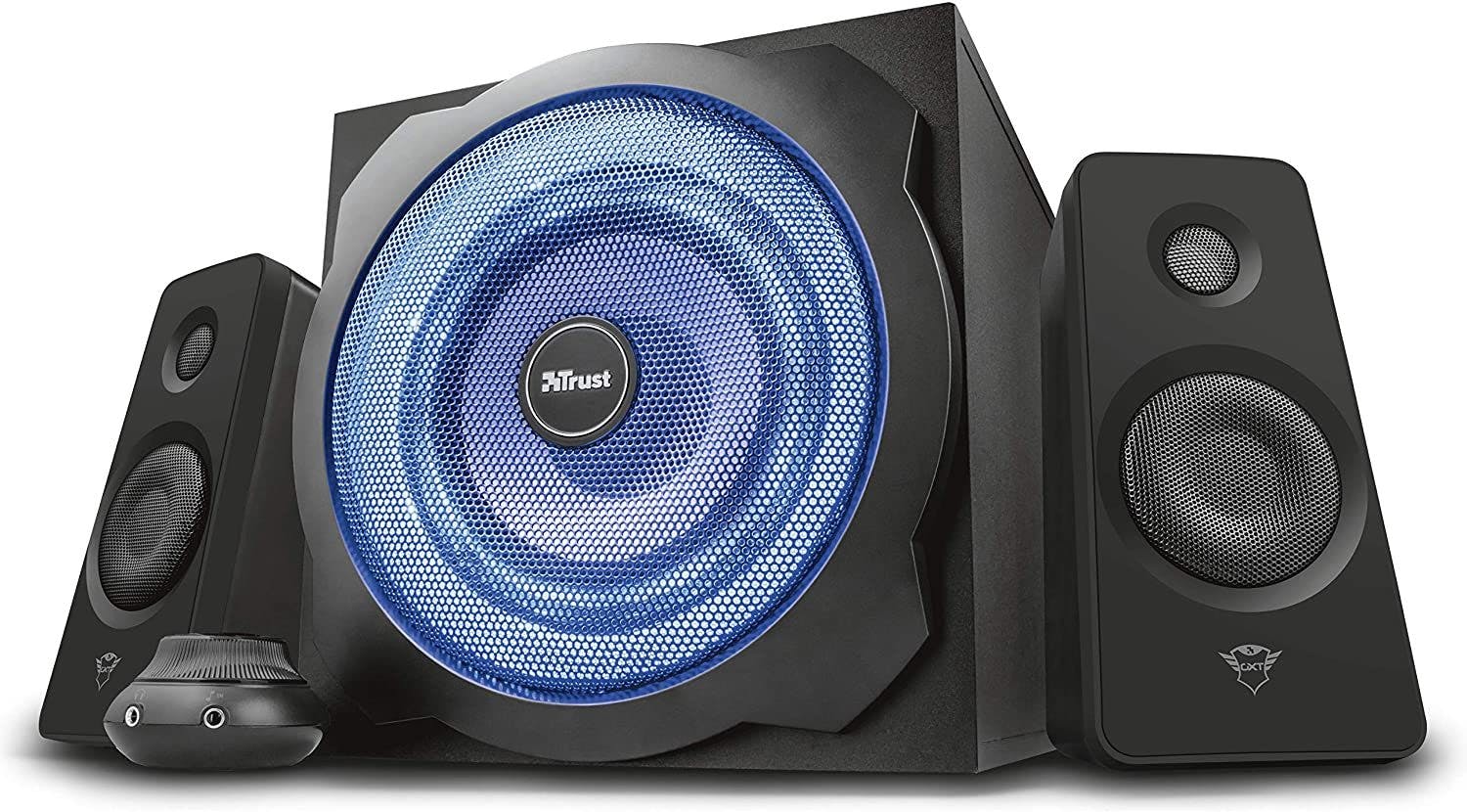 Geen enkele webwinkel verkoopt op het moment van schrijven dit speakersysteem voor zo’n lage prijs als Amazon. Naast twee stoere luidsprekers op het bureau levert Trust ook een forse subwoofer met knipperende ledverlichting mee. Voor liefhebbers van een diepe basweergave is dit product een interessante optie, zoals gamers en filmfanaten. De aanwezige versterker met een piekvermogen van 120 watt is voor pc-begrippen erg krachtig. Een volumeregelaar met vaste kabel maakt het mogelijk om vanaf je zitpositie rechtstreeks het geluidsniveau aan te passen. Op deze unit kun je eventueel ook een hoofdtelefoon aansluiten.