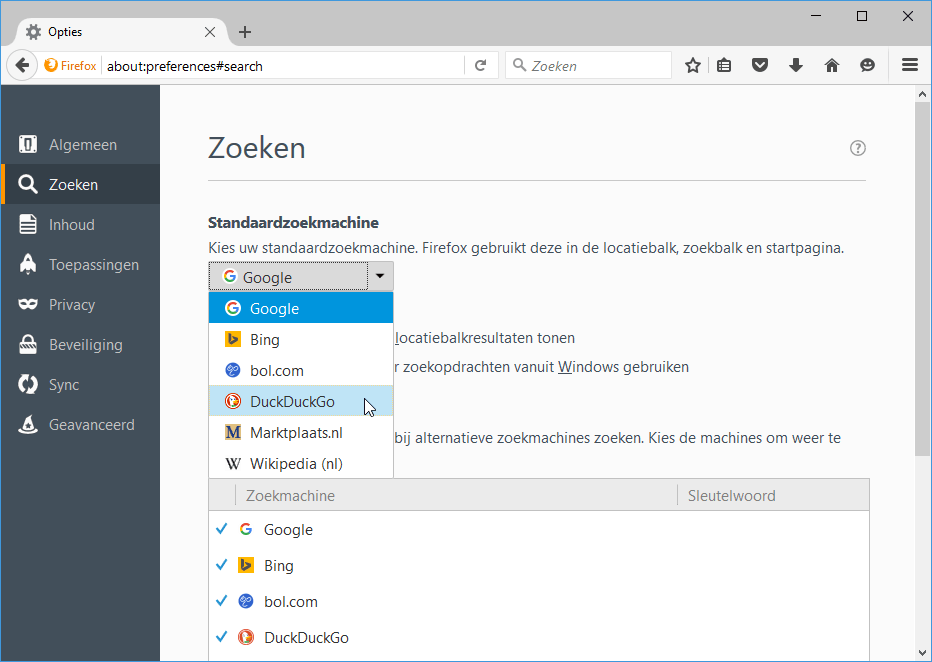 De zoekmachine DuckDuckGo is een populair alternatief voor Google. Bij DuckDuckGo staat privacy hoog in het vaandel, terwijl dat bij Google en Bing allerminst het geval is. De zoekresultaten van DuckDuckGo worden aangevuld met informatie uit onder andere Wikipedia. Als je altijd Google hebt gebruikt moet je wellicht even wennen aan DuckDuckGo, maar dat gaat snel! Je kunt DuckDuckGo ook instellen als alternatief voor Google (stap 7). Bij de opties van Chrometana kun je DuckDuckGo direct kiezen. Voor Firefox-gebruikers is een aparte uitbreiding nodig, genaamd Bing to Duck redirect. Als je deze uitbreiding installeert, is het aan te raden om Bing-Google te verwijderen. Zo voorkom je ‘conflicten’ over welke uitbreiding de Bing-zoekresultaten moet afvangen.