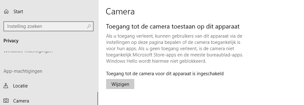 In oudere versies van Windows moest je jezelf een weg banen door actieve processen en informatie over je apparaten om na te gaan welke applicaties je via de webcam in de gaten houden. Vanaf de fameuze Windows-update 1903 zit de controle over de apps die de webcam aanspreken, vervat in de standaard privacy-instellingen. Deze nieuwe functie werkt zowel voor usb-webcams als voor camera’s die zijn ingebouwd in laptops en tablets. Je gaat naar Instellingen en vandaar naar het onderdeel Privacy. Hier zie je meteen of de toegang tot de camera überhaupt is toegestaan op dit apparaat. Wil je dat niet, dan klik je op Wijzigen zodat je de toegang kunt afsluiten.
