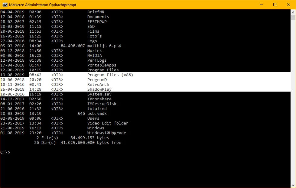 Soms wil je in Opdrachtprompt navigeren naar een mappenstructuur. Als dit korte namen zijn, is dat geen probleem, maar soms kan een mapnaam heel lang zijn. Typ in dat geval de eerste paar tekens van die naam en druk daarna op Tab. Als er geen andere mappen zijn die met dezelfde letters beginnen, zal de gehele mapnaam automatisch worden aangevuld.
