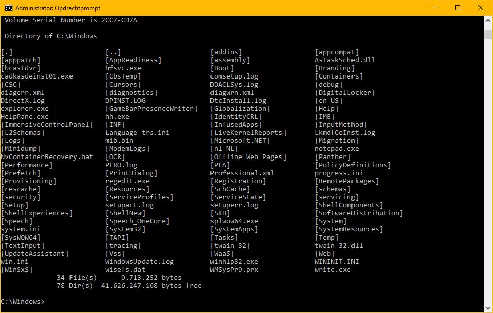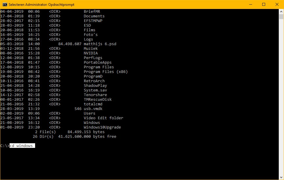Met dit commando open je een map. Zou je in de Verkenner op de map Windows klikken, in Opdrachtprompt typ je dan cd Windows. Zit je al in een map, dan typ je cd.. om een mapje hoger te gaan, of cd\ om helemaal naar de hoofdmap te gaan.