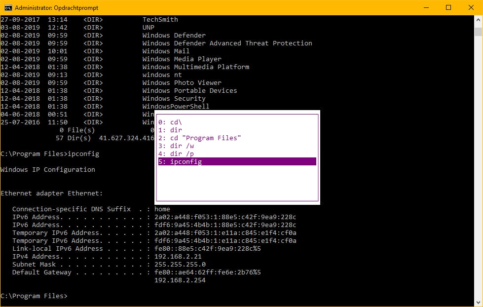 Voor een volledig overzicht van alle commando’s die je deze sessie hebt ingetypt, druk je op F7. Je kunt met de pijltoetsen door dat overzicht scrollen en op Enter drukken om het commando uit te voeren. Wil je om wat voor reden dan ook alle commando’s wissen, dan kun je Opdrachtprompt sluiten, maar een druk op Alt+F7 heeft hetzelfde effect.
