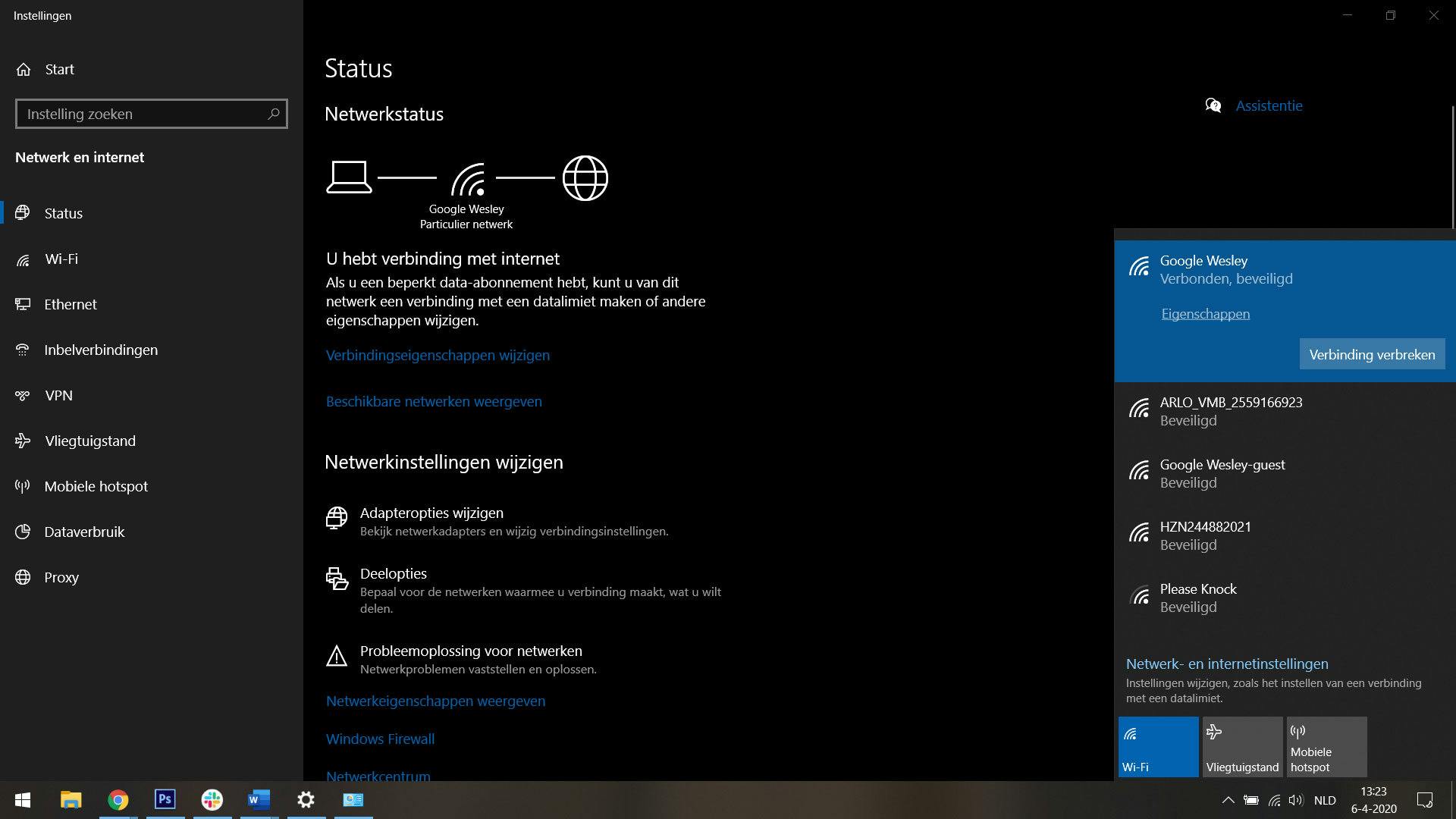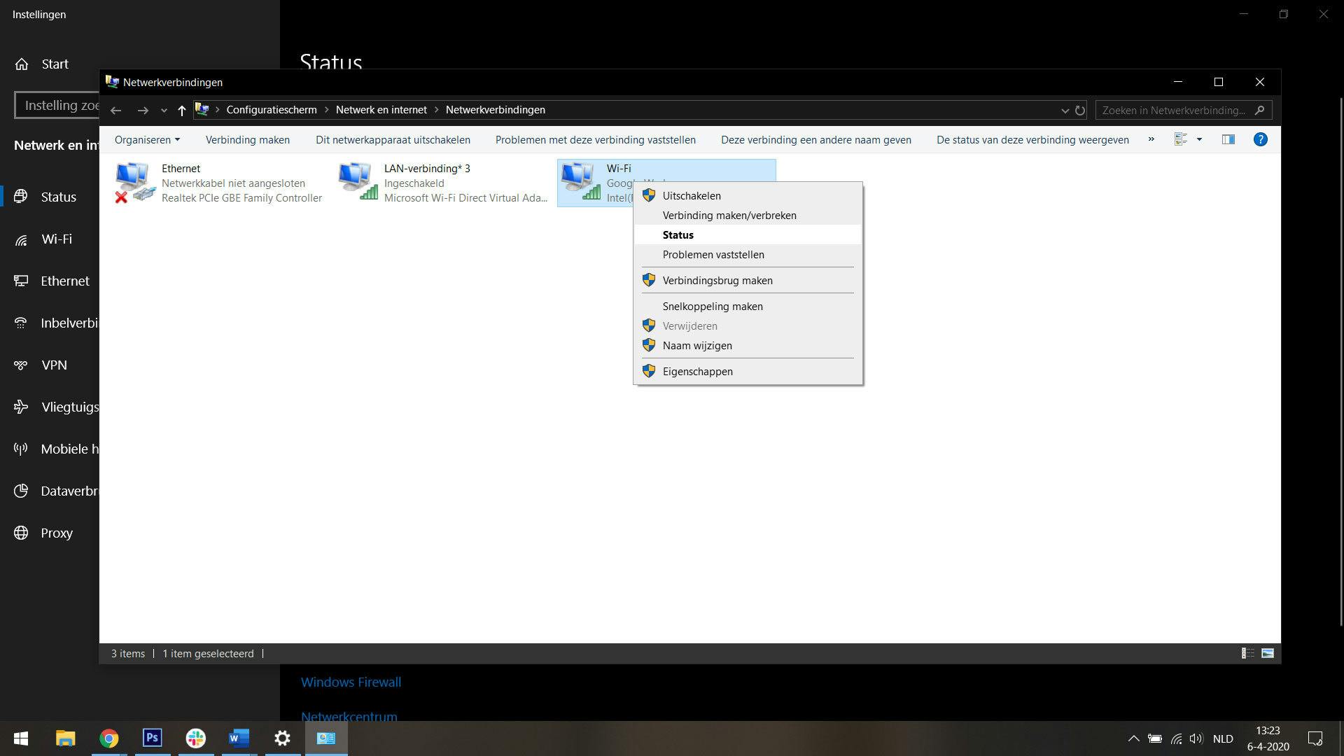 Windows 10 kan dat dus heel snel laten zien, mits je al verbinding gemaakt hebt. Hiervoor open je het startmenu en typ je het woord Netwerkstatus in. Open nu de app die in beeld komt te staan. In beeld staat onder Netwerkinstellingen wijzigen de optie Adapteropties wijzigen. Druk nu met de rechtermuisknop op je wifi-netwerk en kies voor Status.