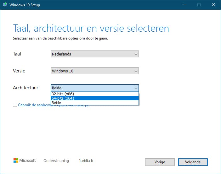 Start de tool en stem in met de licentievoorwaarden. Vink de optie Installatiemedia (USB-stick, dvd of ISO-bestand) voor een andere pc maken aan. In het volgende venster selecteer je een geschikte Windows-versie, bijvoorbeeld Nederlands, Windows 10, 64-bits (x64). Klik op Volgende en vink (bijvoorbeeld) USB-flashstation aan. Daarna verwijs je naar je ingeplugde, lege usb-stick. Bevestig met Volgende en sluit de tool na het proces af met Voltooien.