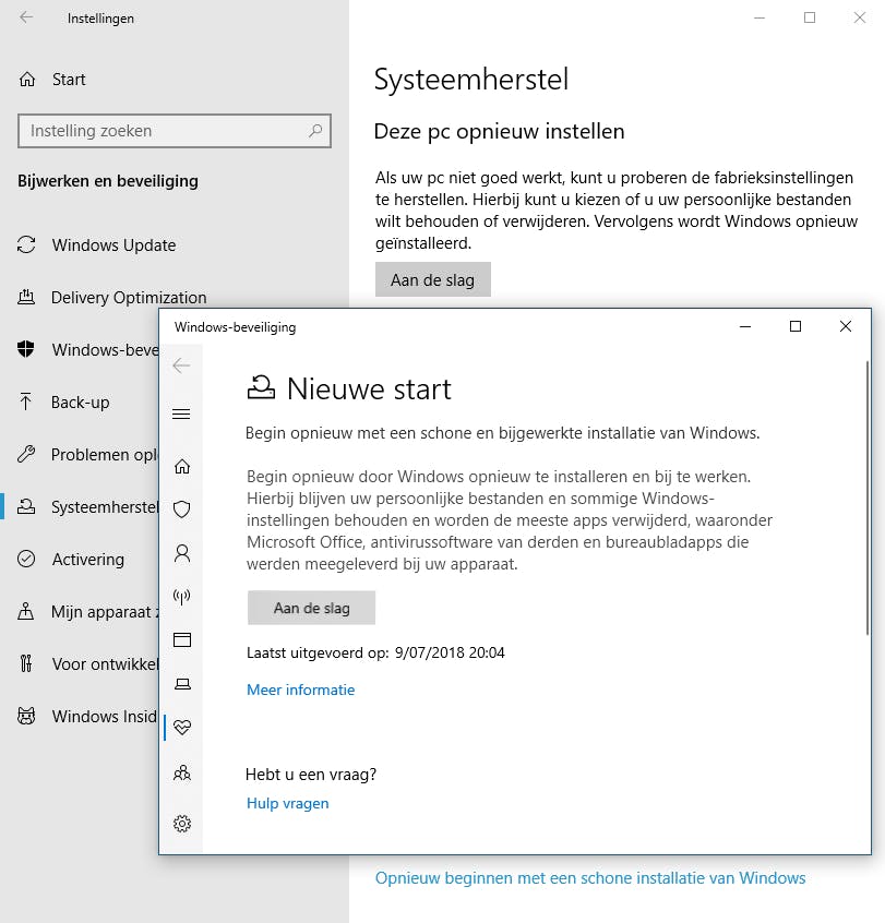 Heb je je systeem al eerder geüpgraded naar Windows 10 en wil je nu een schone installatie, dan is er een makkelijkere methode. Start Windows op en open Instellingen met Windows-toets+I. Selecteer Bijwerken en beveiliging, Systeemherstel.