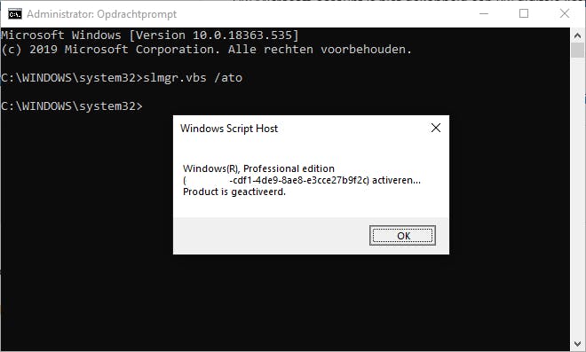 Je verse Windows staat netjes voor je klaar, maar je wilt er wel zeker van zijn dat de activering juist is verlopen. Daartoe open je Windows Instellingen en kies je Bijwerken en beveiliging, Activering. Als het goed is, lees je hier dat Windows inderdaad is geactiveerd. Blijkt de (automatische her)activering toch niet gelukt, dan kunnen een paar reboots helpen. Desnoods open je de opdrachtprompt als administrator en tracht je de activering te forceren met het commando slmgr.vbs /ato.