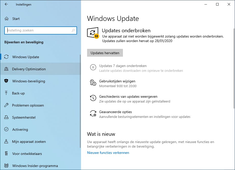 Houd je liever meer greep op het updateproces, dan kun je het updateproces tot vijf weken uitstellen. Je hoeft bij Windows Update alleen maar te klikken op Updates 7 dagen onderbreken. Met Updates hervatten hef je deze onderbreking op.