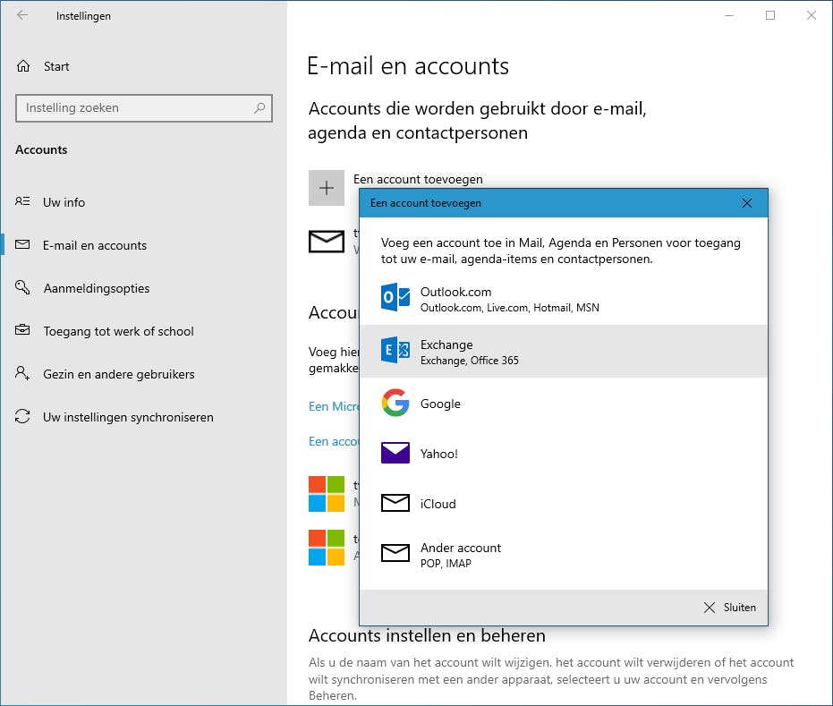 Windows laat je je Microsoft-account ook met andere apps koppelen. Dat regel je vanuit Windows Instellingen, waar je Accounts kiest en vervolgens E-mail en accounts, Een account toevoegen selecteert.
