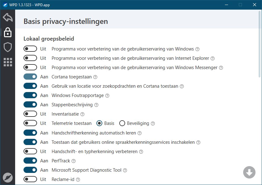 Of je zet een portable tool in zoals Windows Privacy Dashboard. Start de app als administrator en klik bij voorkeur eerst het cirkelpictogram aan om een herstelpunt te maken. Vervolgens kies je Privacy, waarna je een overzicht krijgt van enkele tientallen in- en uitschakelbare privacy-instellingen,
