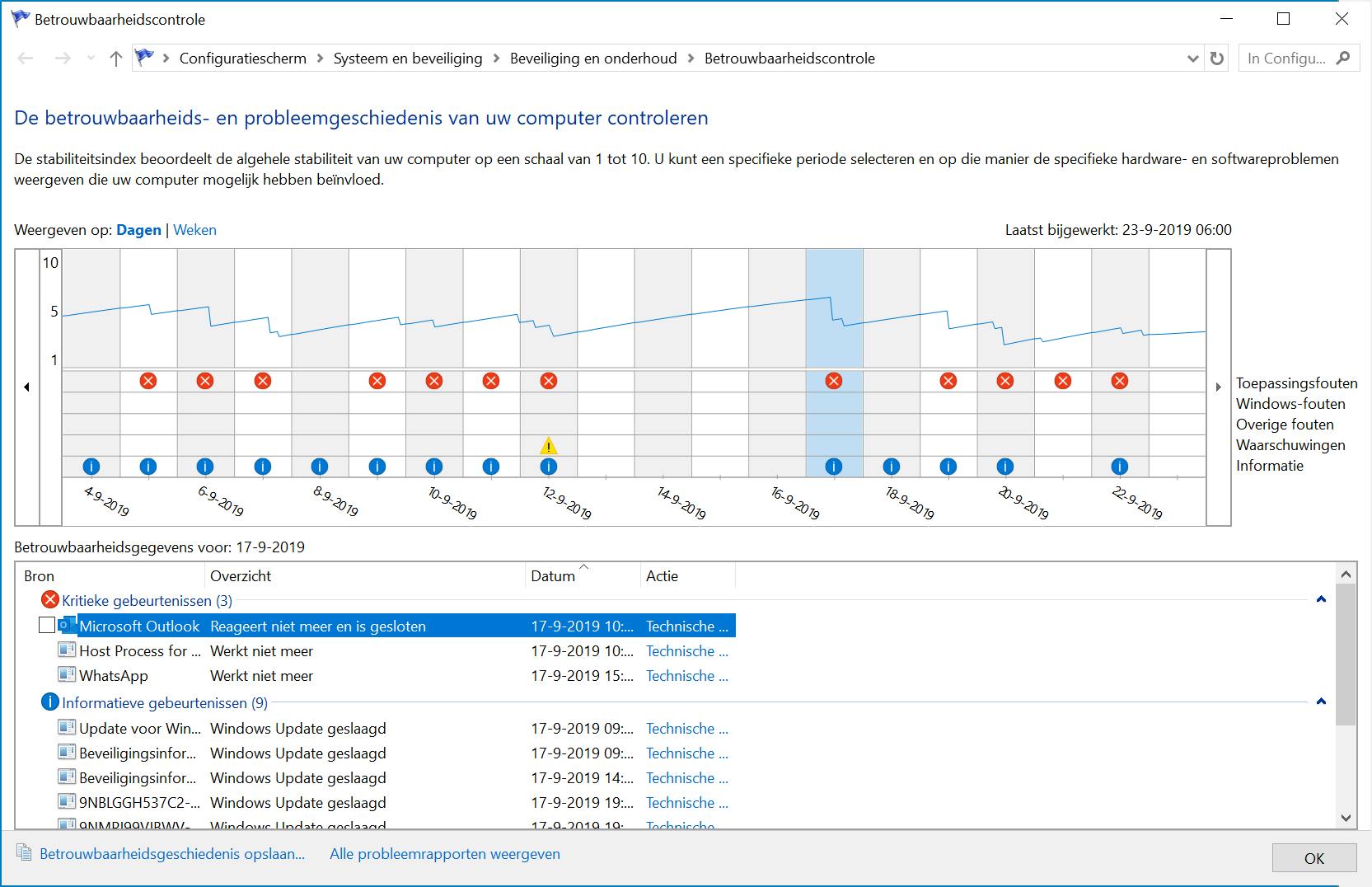 Voor meer informatie over de melding klikt je erop met rechts en kies je voor Technische details weergeven. Je kunt de details bewaren en later raadplegen, door te klikken op Naar het klembord kopiëren. Om meer details te zien over een langere periode, kies je bij Weergeven op voor Weken.