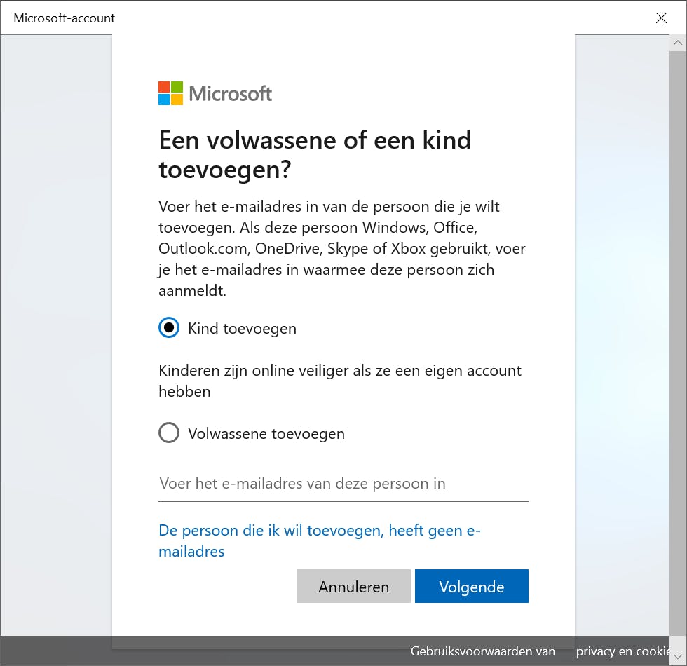 Klik op De persoon die ik wil toevoegen, heeft geen e-mailadres. Alle nieuwe gebruikers worden toegevoegd aan de lijst Gezin en andere gebruikers. Hierna geef je nog expliciet aan dat het kind zich mag aanmelden. Klik op het gebruikersaccount en kies Toestaan. In het bevestigingsvenster klik je nogmaals op Toestaan.