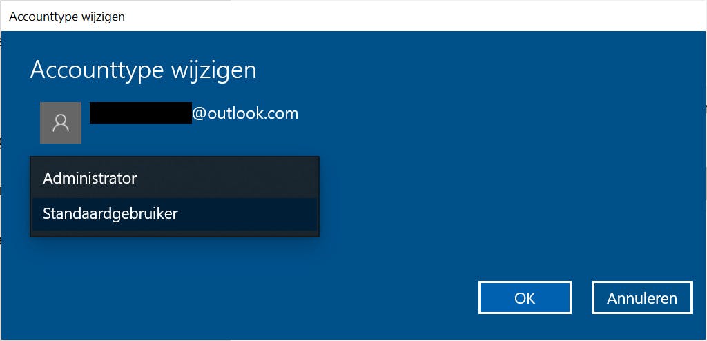 Heb je meerdere gebruikersaccounts op de computer, zorg er dan voor dat ze over de juiste rechten beschikken. Niet elke gebruiker hoeft administrator-rechten te hebben. In het instellingenvenster kies je voor Accounts, Gezin en andere gebruikers. Bij Andere gebruikers klik je op de naam van de gebruiker. Kies voor Accounttype wijzigen. Wijzig Administrator in de lijst bij Accounttype in Standaardgebruiker. Herhaal deze stappen voor alle accounts op de computer, behalve voor je eigen account. Er moet altijd minstens één administrator-account op de computer beschikbaar zijn.