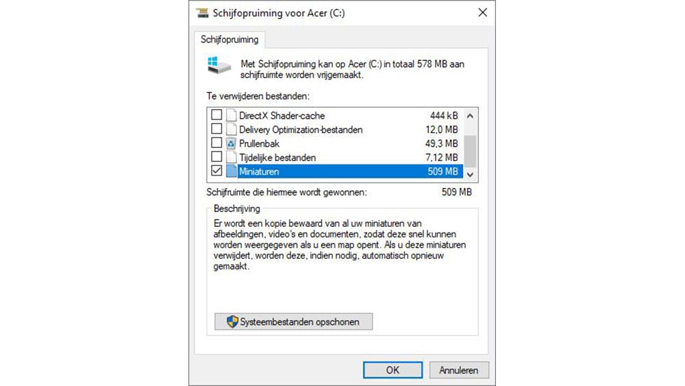 Klik hierna op Systeembestanden opschonen. Het programma geeft bovenin aan hoeveel ruimte kan worden vrijgemaakt als je alle opties aanvinkt. Rechts zie je telkens de hoeveelheid gigabytes die je kunt vrijmaken. Vooral de onderdelen Windows Update opschonen, Tijdelijke Windows-installatiebestanden, Upgradelogboekbestanden van Windows en Miniaturen zijn ruimteverslinders.