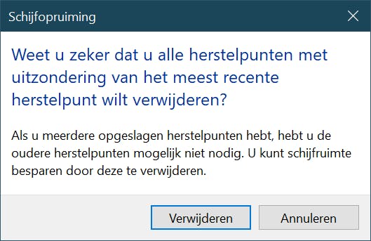 Open de tab Meer opties van het eerder geopende venster Schijfopruiming en klik in het vak Systeemherstel en schaduwkopieën op Opruimen. Windows vraagt of je het zeker weet: klik op Verwijderen. Deze dieetingreep is uiteraard tijdelijk, want Windows zal hierna gretig weer meerdere punten aanmaken.