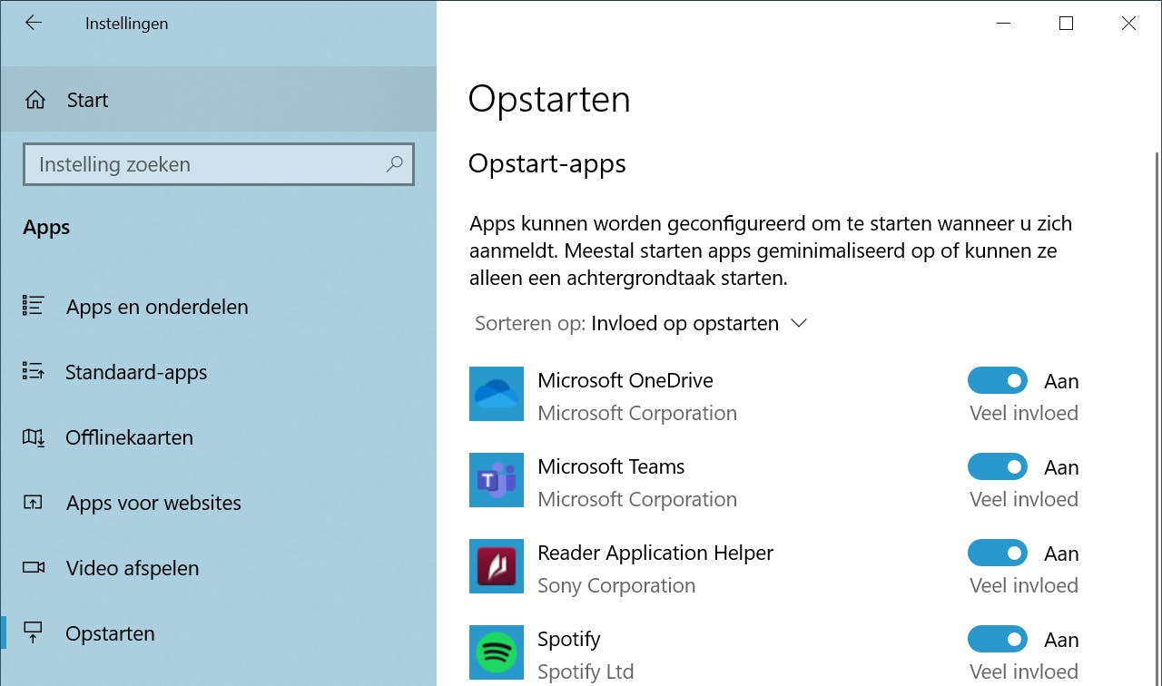 Keer terug naar Apps en onderdelen en kies bij Sorteren op voor Grootte. Loop nu door alle programma’s en verwijder de programma’s die je niet nodig hebt. Open hierna de sectie Opstarten, links in het venster. Hier vind je de apps die worden opgestart. Kies bij Sorteren op voor Invloed op opstarten: programma’s die veel vertraging veroorzaken, verschijnen bovenaan. Zet de schuifjes op Uit bij de programma’s die niet meer mogen opstarten.