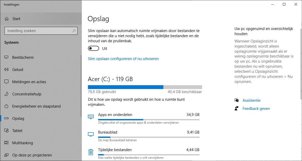 Het begint met inzicht: waar besteedt Windows onze kostbare schijfruimte aan? Open het instellingenvenster (Windows-toets+I) en kies Systeem, Opslag. Bij Local Disk zie je hoeveel schijfruimte momenteel wordt gebruikt en hoeveel gigabytes nog beschikbaar zijn. De lijst eronder geeft per categorie weer hoeveel capaciteit wordt gebruikt. Zo zie je hoeveel ruimte apps in beslag nemen, maar ook hoeveel ruimte wordt opgeslokt door tijdelijke bestanden of e-mailberichten.