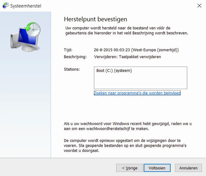 Een functie die al bekend is van vorige Windows-versies is Systeemherstel. Met Systeemherstel kun je een herstelpunt maken op het moment dat de pc stabiel en goed werkt, maar er worden bijvoorbeeld ook automatisch herstelpunten gemaakt. Dat doet Windows elke keer wanneer er een nieuwe app wordt geïnstalleerd, of een nieuwe driver, of een Windows-update.
