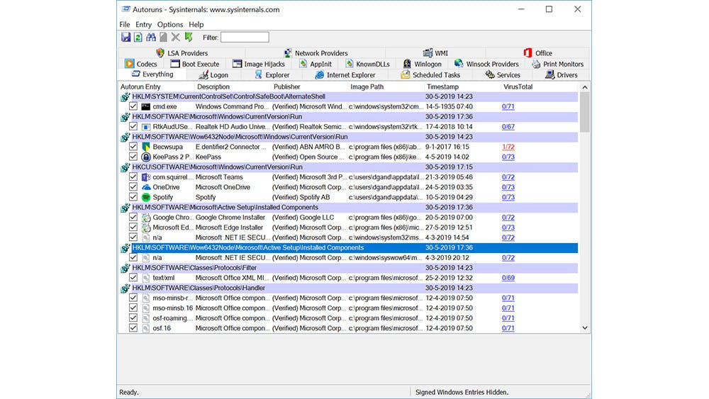 Standaard toont AutoRuns ook alle opstartitems van Microsoft. Dat zijn vaak onderdelen die bij Windows horen en voor een goede werking van het besturingssysteem noodzakelijk zijn. Je kunt de Windows- en Microsoft-vermeldingen door AutoRuns laten verbergen. Voordeel hiervan is dat de lijst een stuk overzichtelijker wordt en je je alleen nog hoeft te richten op ‘externe’ opstartonderdelen.