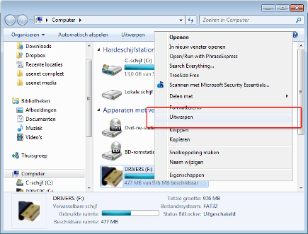 Om het helemaal veilig en volgens de regels te doen, klikt u met de rechtermuisknop op de usb-stick en kiest u Uitwerpen.