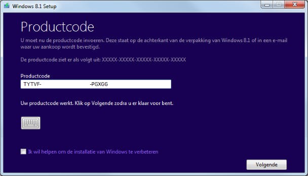 Allereerst surf je naar deze website, waar je via de link Windows 8 Setup het bijbehorende EXE-programma downloadt. Dat start je op vanaf een computer met Windows Vista of hoger. Let op: het moet dan wel gaan om een systeem met dezelfde architectuur (32 of 64 bit) als de pc waarop je een geldige versie van Windows 8.1 hebt draaien, voor zover het al niet om dezelfde computer gaat. De productcode van je Windows 8.1 houd je bij de hand, want er verschijnt meteen een dialoogvenster dat je om die code vraagt. Je vindt hem over het algemeen op een sticker op je computer of eventueel in een e-mail met je aankoopbevestiging. Druk daarna op Volgende.