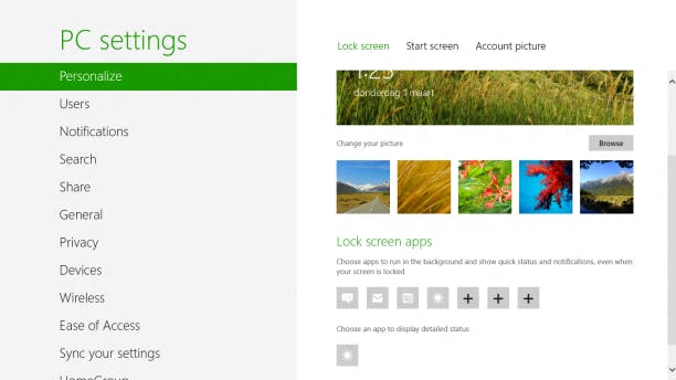 Er kan nu flink geknutseld worden aan het lock-screen (het ontgrendelingsscherm). In dit scherm kunnen verschillende elementen weergeven worden, zoals het aantal nieuwe ontvangen e-mails en berichten, het actuele weer, de tijd en ook andere informatie uit zelfgekozen apps. Om dit te configureren gaat u in de PC Settings naar Personalize en vervolgens kiest u boven in het scherm voor het onderdeel Lock Screen.