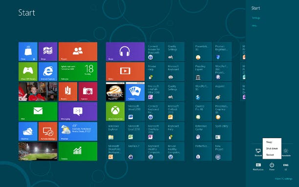 Op het Windows Experience Blog merkt Microsoft op dat 'dat veel mensen die Windows 8 de eerste keer gebruiken, enige hulp lijken te kunnen gebruiken'. Een understatement: hulp is direct al handig bij het inloggen. Nergens geeft het scherm namelijk enige hint over hoe u verder moet. Wat u moet doen om in te loggen is met de muis het beeld dat u ziet, omhoog slepen. Handiger is het een willekeurige toets in te drukken, dan wordt de login namelijk direct ook zichtbaar. Ook afsluiten en opnieuw opstarten zijn in Windows 8 vakkundig verstopt. Open de Charms door de muis in de rechterbovenhoek te plaatsen, klik op Settings / Power en kies voor Sleep, Restart of Shutdown.
