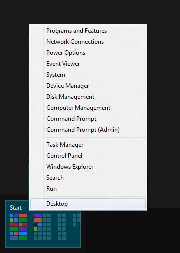 Door met de rechtermuisknop op de pop-up voor het startscherm te klikken, opent u een menu met toegang tot de geavanceerde onderdelen van Windows 8.