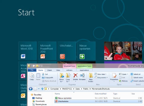 Start8 werkt vertrouwder als u het Metro-scherm uitrust met knoppen om de computer opnieuw te starten en uit te schakelen. Hiertoe kunt u twee snelkoppelingen maken, een met als opdracht shutdown /s /t 5 en een met opdracht shutdown /r /t 5. Geef de eerste snelkoppeling de naam Afsluiten en de tweede Opnieuw opstarten. Klik dan met de rechtermuisknop op iedere koppeling en kies Pin to start om ze aan het startscherm te koppelen. Via rechtsklik Properties / Change icon kunt u ze eerst nog een beter herkenbaar pictogram geven.