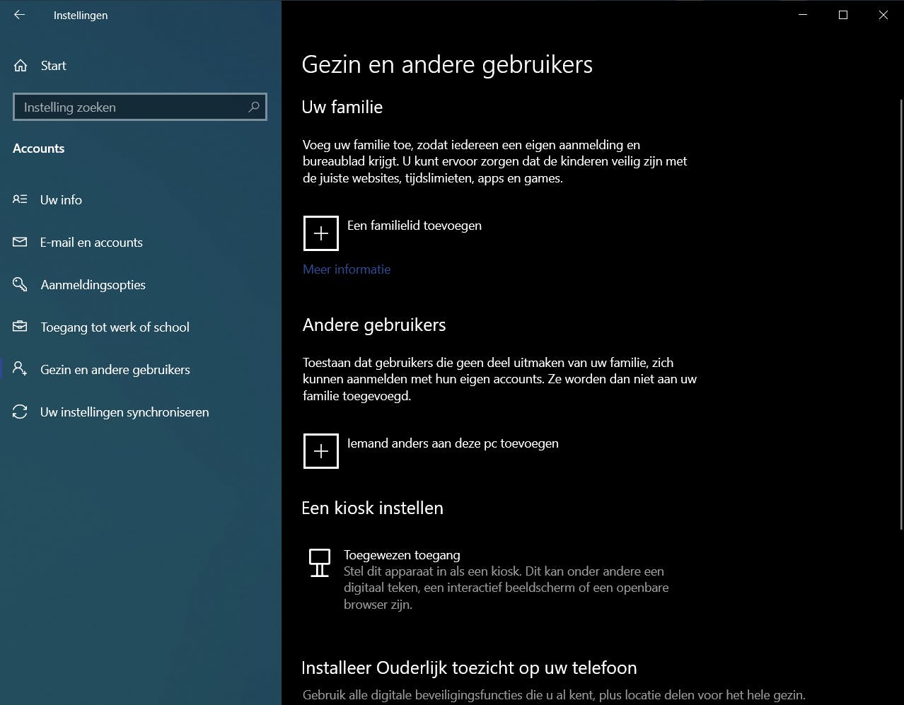Selecteer na een klik op de Windows-startknop de functie Instellingen en klik daarna op Accounts. In het scherm dat je dan ziet, klik je op Gezin en andere gebruikers. In dit scherm zie je meteen een tweesprong: je kunt kiezen tussen het toevoegen van gezinsleden en ‘Andere gebruikers’.