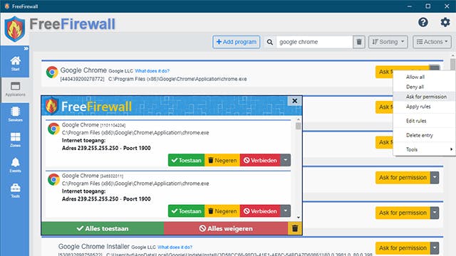 Wijzig Allow all bij bijvoorbeeld Google Chrome maar even in Ask for permission en herstart de browser. In een pop-upvenster vraagt EFF nu wat je met alle bijbehorende internetverbindingen wilt doen. Die kun je weliswaar afzonderlijk verbieden (Prohibit) of toelaten (Allow), maar je vindt het wellicht handiger om die voor de betreffende applicatie in één keer toe te staan (Allow all) dan wel te blokkeren (Deny all).