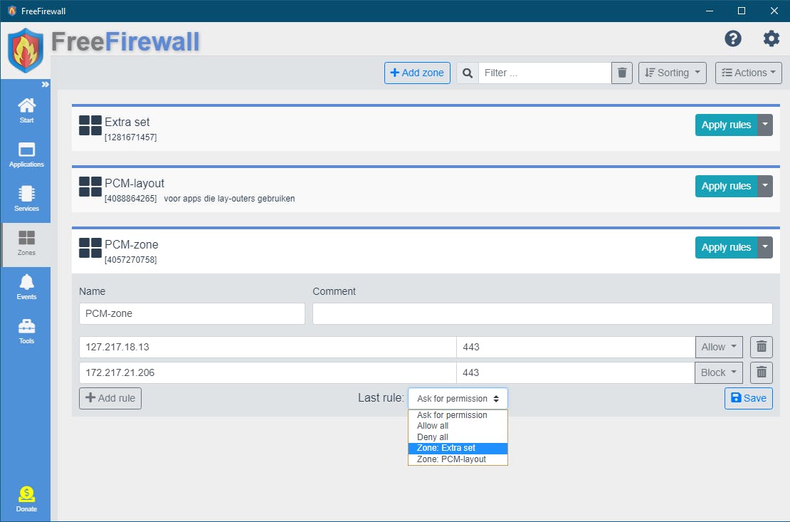 Op het tabblad Zones kun je regelsets toevoegen en die vervolgens aan verschillende applicaties koppelen. Dat kan handig zijn wanneer je dezelfde firewallregels voor meerdere toepassingen wilt inzetten. Klik eerst op Add Zone en voorzie een naam. Vervolgens voeg je met Add rule de gewenste regel(s) toe, evenals de Last rule. Bevestig je keuzes met Save. De zone met de regels wordt gemaakt en kun je nu aan de gewenste programma’s koppelen door die in het uitklapmenu van de optie Edit rules te selecteren.