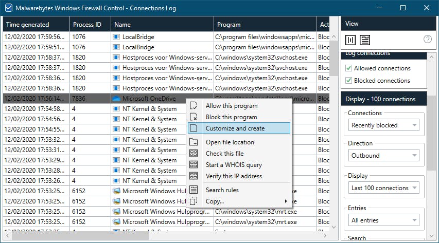 Tot slot ook handig: via de knop Show Windows Firewall connections log (links onderaan) krijg je de meest recente toegestane en/of geblokkeerde verbindingen te zien en ook hier kun je vanuit het contextmenu nog allerlei wijzigingen aanbrengen.