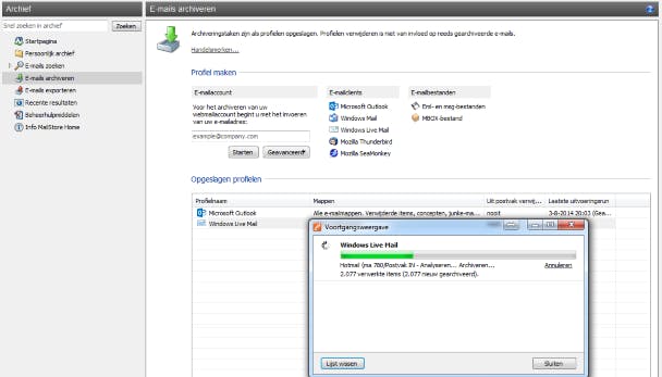 Met het programma MailStore Home, kunnen van verschillende e-mailprogramma's e-mails worden opgeslagen naar een archief en later weer worden teruggezet. Een andere optie is de gegevens via de e-mailclient zelf back-uppen. Hierover kun je een uitgebreide cursus op onze website vinden.