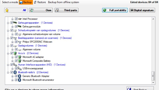 Zeker bij oudere systemen is het erg lastig om de juiste drivers terug te vinden. Maak daarom, voordat je het systeem opnieuw installeert, een back-up van de drivers. Het opensource programma DriverBackup 2 kan dat in een handomdraai. Zodra het programma is gestart, klik je rechtsonder op Start Backup. Kopieer deze map naar de back-upschijf of de cloud. Nadat het systeem opnieuw geïnstalleerd is, open je DriverBackup 2 en klik je bovenin op Restore. Klik op Open Backup file, selecteer het bki-bestand dat in de back-upmap staat en klik op Openen. Selecteer de benodigde drivers en klik op Restore. Start de computer vervolgens opnieuw op.