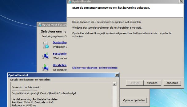 Bootsectorvirussen zijn flink in opkomst. Deze virussen verwijderen de partitietabel van de harde schijf (ook wel master boot record of MBR genoemd). Zonder MBR weet de computer niet welke gegevens geladen moeten worden om het systeem te starten. In zo'n geval kun je vaak ook niet herstellen met een herstelpartitie. De enige remedie is de computer starten via een systeemherstelschijf (zie kader 'Systeemherstelschijf maken'). Start Windows 7 met de systeemherstelschijf en selecteer de juiste toetsenbordindeling. Kies de optie Hulpprogramma's voor herstel gebruiken en klik op Volgende. Kies Opstartherstel, wacht tot het systeem is hersteld en druk op Voltooien.