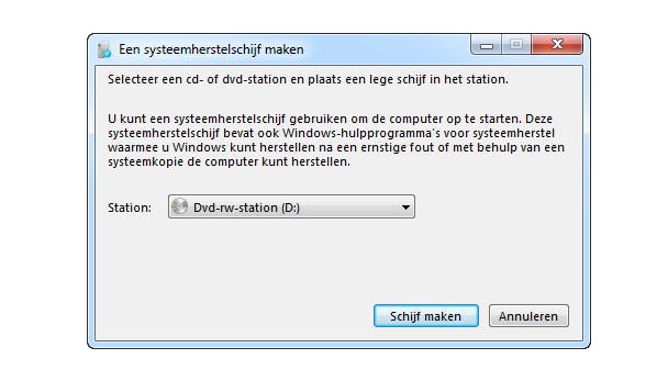 Als de computer niet meer werkt, kan deze vaak met een systeemherstelschijf worden gerepareerd. Het is verstandig zo'n schijf altijd in huis te hebben. Je kunt deze schijf in Windows 7 maken door Uitvoeren te starten (Windows-toets+R) en het commando recdisc.exe in te tikken (gevolgd door een Enter). Selecteer het station waar een beschrijfbare dvd inzit en klik op Schijf maken. Let er wel op dat een herstelschijf van een 64bit-systeem niet zal werken op een 32bit-systeem. In Windows 8 kun je een herstelstation maken. Start Uitvoeren en tik het commando RecoveryDrive.exe (gevolgd door Enter). Plaats een usb-stick en klik op Volgende. Selecteer de usb-stick, klik op Volgende en op Maken.