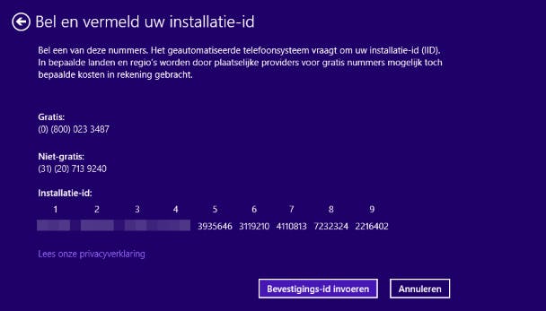 Soms wil Windows niet activeren via internet. Dit is op te lossen door Windows telefonisch te activeren via Microsoft productactiveringen. Om Windows telefonisch te activeren, start Uitvoeren en geef het commando SLUI 4 (gevolgd door een Enter). Kies in het menu Nederland en klik op Volgende. Als het Installatie-id in beeld staat, bel je het gratis telefoonnummer en luister je naar de uitleg. Na de uitleg wordt gevraagd om het Installatie-id. Geef deze telefonisch door. In Windows 7 kan het Bevestings-id direct eronder worden ingevuld, in Windows 8 klik je eerst op Bevestigings-id invoeren. Als het bandje met de telefoniste vraagt op hoeveel computers Windows is geïnstalleerd, kies je één. Vul vervolgens het Beveiligings-id in en druk op Windows activeren.