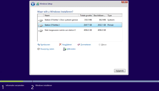 Formatteer het station waarop je Windows wilt installeren en klik op Volgende.