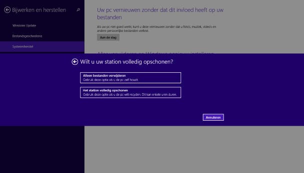 Via een functie in Windows 8.1 kan het systeem gemakkelijk worden teruggebracht in zijn oorspronkelijke staat. Hiervoor dien je wel over het installatie- of herstelmedium te beschikken. Zorg dat alle bestanden geback-upt zijn en het originele installatiemedium in de computer zit. Druk op de Windows-toets+I en klik op Pc-instellingen wijzigen. Ga naar Bijwerken en herstellen en kies Systeemherstel.