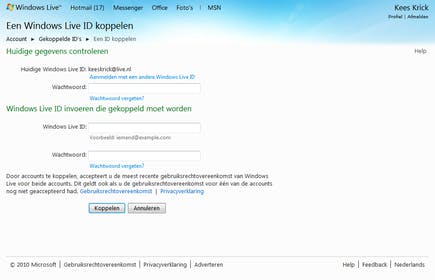 Om een koppeling tussen Windows Live ID’s tot stand te brengen, surft u naar http://account.live.com/ en meldt u zich met een account aan. Bij het onderdeel Andere opties klikt u op Gekoppelde ID’s. Op het volgende scherm klikt u op Een gekoppelde ID toevoegen. Bij het onderdeel Windows Live ID invoeren die gekoppeld moet worden tikt u het Windows Live ID en het wachtwoord in van het account dat u wilt koppelen. Ter controle moet u bij Huidige gegevens controleren eerst nog even het wachtwoord van het huidige account (waarmee u nu bent aangemeld) intikken. Klik ten slotte op de knop Koppelen.