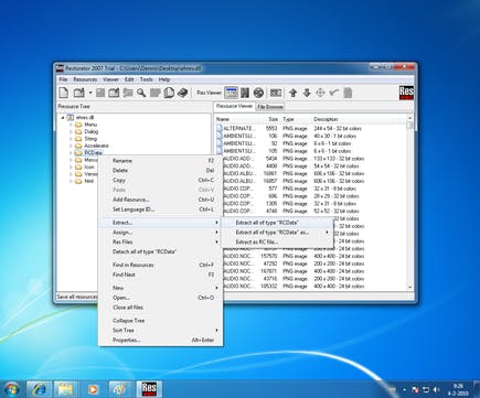 Een thema bestaat uit meerdere onderdelen, zoals pictogrammen, afbeeldingen en titels. Als u deze elementen wilt aanpassen, is het handig om eerst de oorspronkelijke elementen te verzamelen. Maak een nieuwe map aan (bijvoorbeeld op het bureaublad) en noem deze Componenten. In het linkervenster van Restorator klikt u met de rechtermuisknop op RCData. Kies voor Extract all of typ RCData. Kies ervoor om de bestanden op te slaan in de zojuist gemaakte map Componenten. Open de map. U ziet hierin nu alle beschikbare visuele componenten van Media Center.