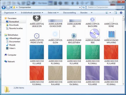 U ziet het al aankomen: nu u de map met visuele componenten hebt, kunt u deze vervangen door uw eigen creaties. Media Center zorgt ervoor dat afbeeldingen automatisch de juiste afmeting krijgen zodra ze worden getoond. U kunt dus afbeeldingen in een relatief hoge resolutie gebruiken. Dit komt de uitstraling van Media Center – vooral op hoge resolutie schermen – bijzonder ten goede! De standaardafmeting van veel afbeeldingen is 500 bij 300 pixels. U kunt uw eigen grafische software gebruiken om de afbeeldingen te maken. Sla de bestanden op in hetzelfde formaat als de oorspronkelijke bestanden. U mag hierbij ook gebruikmaken van transparante vlakken; kijk goed naar de oorspronkelijke onderdelen en zie hoe hier van doorzichtigheid gebruik wordt gemaakt.