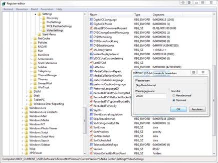 Via het Windows-register kunt u deze tijd aanpassen. Handig, als u bijvoorbeeld snel door reclameblokken wilt spoelen. Open het Windows-register: in het menu Start typt u Regedit.exe. Druk vervolgens op Enter. Blader naar de sleutel HKEY_CURRENT_USER\Software\Microsoft\Windows\CurrentVersion\Media Center\Settings\VideoSettings. In het rechtervenster klikt u met rechts op SkipAheadInterval. Kies Aanpassen. Selecteer Decimaal en verander de waarde in het vak Waardegegevens. Reken hierbij in milliseconden. Wilt u 20 seconden vooruitspoelen, dan typt u hier 20000. Klik op OK. Hoeveel er wordt teruggespoeld, bepaalt u via InstantReplayInterval. Klik erop met rechts en kies Aanpassen. Vul bij Waardegegevens de gewenste speelduur in.