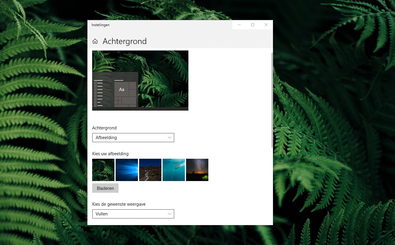 De meeste personalisatiefuncties zijn in Windows 10 op een centrale plek bereikbaar. Klik met de rechtermuisknop op het bureaublad en selecteer Aan persoonlijke voorkeur aanpassen. Hiermee kom je in het venster waar je nieuwe afbeeldingen als bureaubladachtergrond instelt. Je krijgt een selectie van vijf foto’s te zien, maar via Bladeren kom je bij ieder afbeeldingsbestand op de harde schijf. Nadat je de achtergrond hebt geselecteerd, moet je aangeven hoe deze op het scherm past, want niet iedere afbeelding heeft dezelfde beeldverhoudingen als je computerscherm. De weergave-keuzes zijn: Vullen, Aanpassen, Spreiden, Naast elkaar, Centreren en Over meerdere schermen. Die laatste is een optie om een hele brede afbeelding te verdelen over meerdere computerschermen.