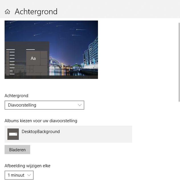 Vind je steeds dezelfde afbeelding op je bureaublad te saai? Dan kun je in de persoonlijke voorkeurinstellingen aangeven dat je een trage diavoorstelling wilt zien. In het vak Achtergrond selecteer je dan Diavoorstelling en vervolgens kies je de map met achtergrondafbeeldingen die op dezelfde manier zijn opgemaakt (zelfde verhouding/formaat). Je laat de foto’s afwisselen met intervallen van één minuut, 10 minuten, 30 minuten, één uur, zes uur of een dag.