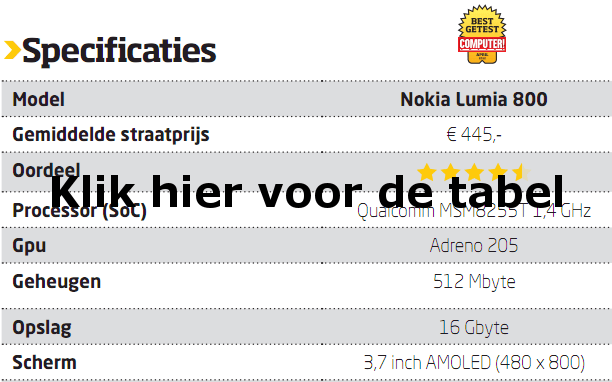 De Lumia 800 is het toestel dat Nokia weer op de kaart moet zetten en het moet gezegd worden: het is een erg fraai toestel geworden. De behuizing van de Lumia 800 oogt heel bijzonder en is gemaakt uit één stuk kunststof. Het scherm heeft aan de voorkant een lichte bolling en maakt gebruik van een AMOLED-paneel. Net als bij de Samsung Omnia wordt ook bij dit paneel de PenTile-rangschikking gebruikt, waardoor sommige kleuren wat korrelig ogen. In de praktijk zien we weinig verschil tussen de schermen van de Lumia 800 en de Omnia W. Het scherm van deze Nokia Lumia is dan ook - net als het scherm van de Samsung Omnia W - uitstekend, en door zijn goede zwartweergave uitermate geschikt voor Windows Phone 7.5. Aanvankelijk had het toestel een probleem met de accu, maar dat lijkt na een aantal updates te zijn opgelost.